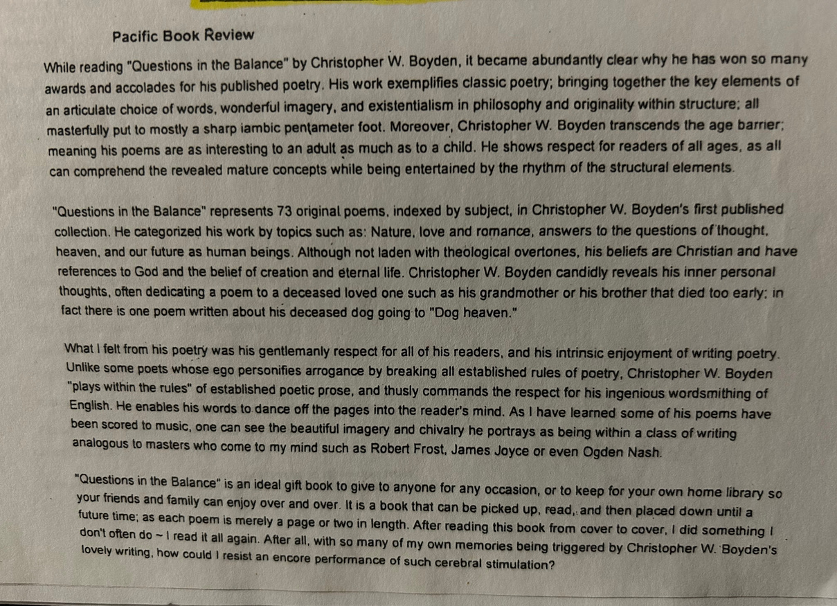 Award-winning author Christopher W. Boyden is transforms every day experiences into works of lyrical art that can be enjoyed by both young and old.. He translates his own search for meaning into bite-sized, works of wonder that will have you saying, "Wow, I never thought of it that way!"